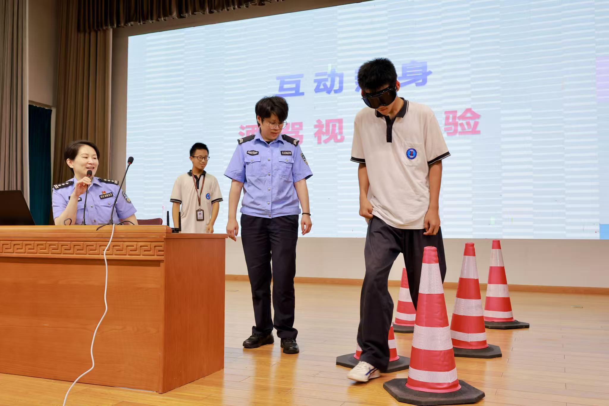 讲座伊始,蒋警官便通过一个新颖的互动实验点燃了现场气氛。她邀请两位同学上台,佩戴上模拟夜间酒驾的眼镜,并尝试完成绕桩和将吸管插入瓶子这两个简单的任务。在眼镜的干扰下,同学们原本简单的动作变得困难重重。警官借此向大家揭示了酒后驾车的真正危险。她告诉同学们:哪怕只是0.5秒到1秒的延迟,对于一辆时速60公里的汽车来说,就意味着“盲开”了超过16米的距离,其潜在后果不堪设想。