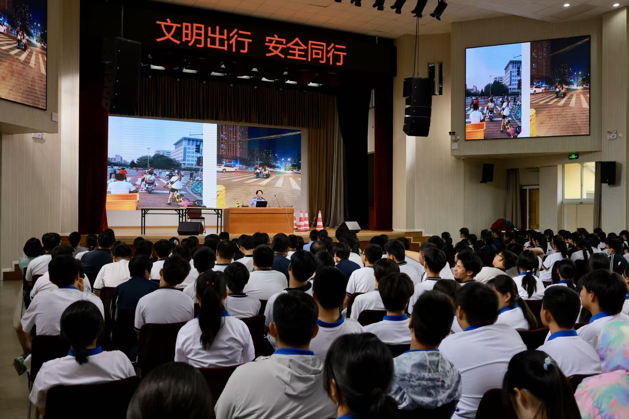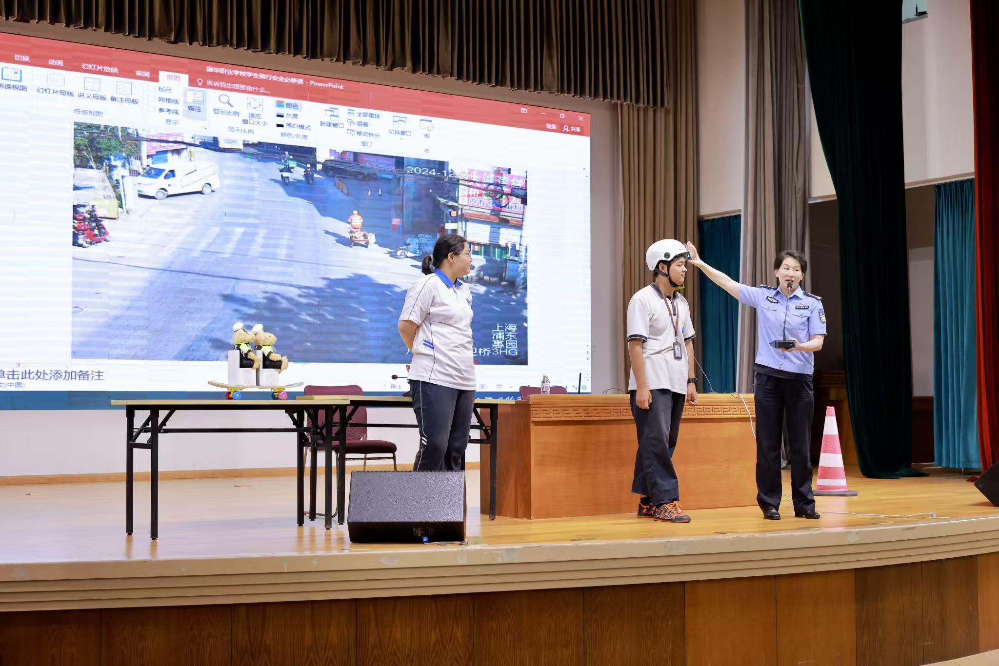 2025年9月26日,一场别开生面的交通安全主题讲座在浦东北路校区大礼堂举行,其他两个校区的同学则通过直播形式进行了线上观看。本次交通安全讲座由浦东交管支队车宣大队长于亦季警官带领宣讲团队为学生服务,浦东交管支队车宣大队资深警官蒋勤以生动有趣的互动和发人深省的真实案例,为同学们上了一堂主题为“安全‘骑行’,‘步步’为赢”的交通安全课,旨在提升学生们的安全出行意识,筑牢生命安全防线。