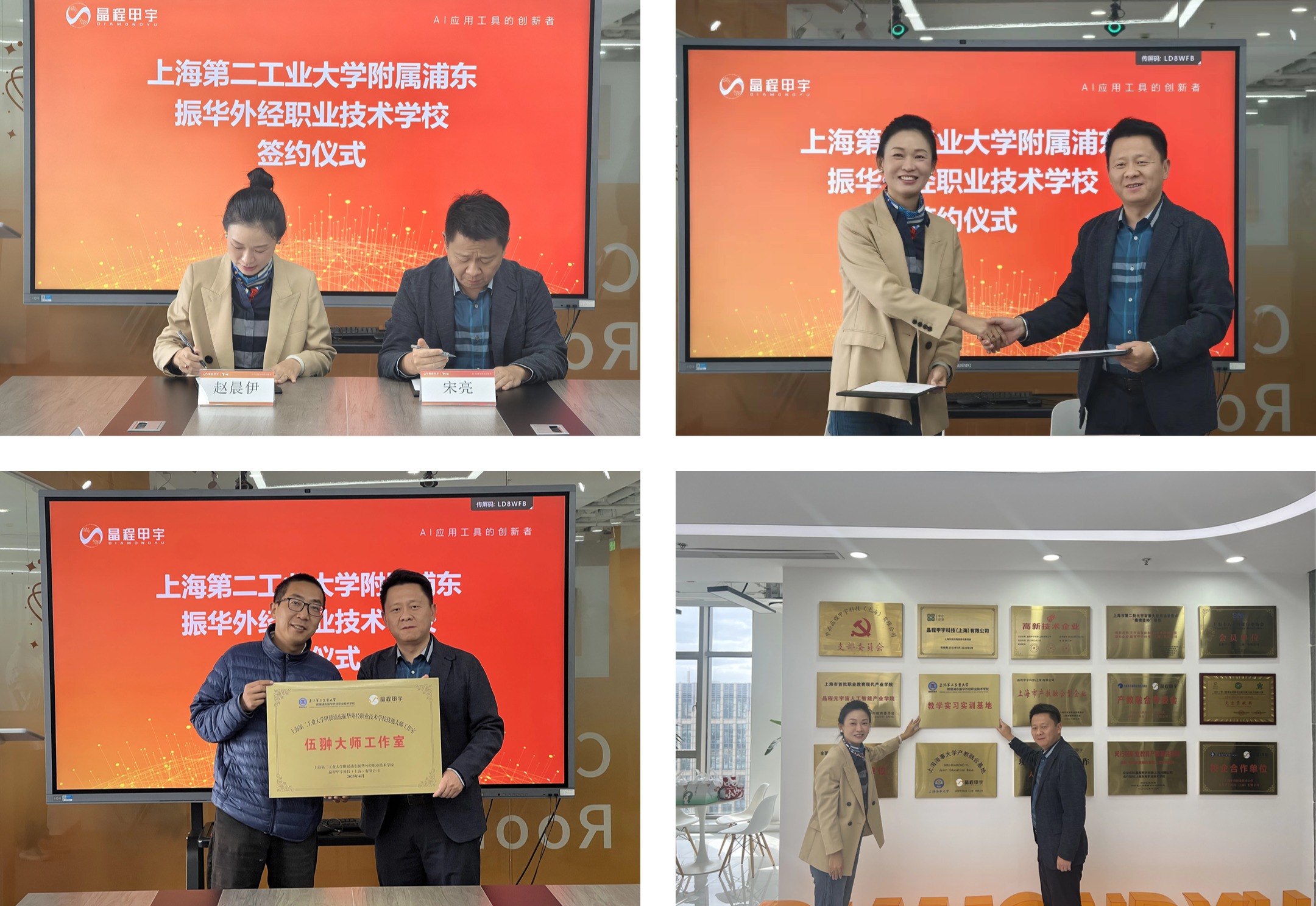 2025年10月22日,上海第二工业大学附属浦东振华外经职业技术学校宋亮校长一行赴晶程甲宇科技(上海)有限公司开展人工智能教育专题考察交流。双方围绕教育数字化转型、人工智能课程体系建设及师资培养等核心议题展开深入研讨,并举行合作签约仪式,共同为校内工作室和校外实训基地揭牌。