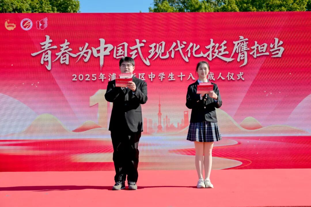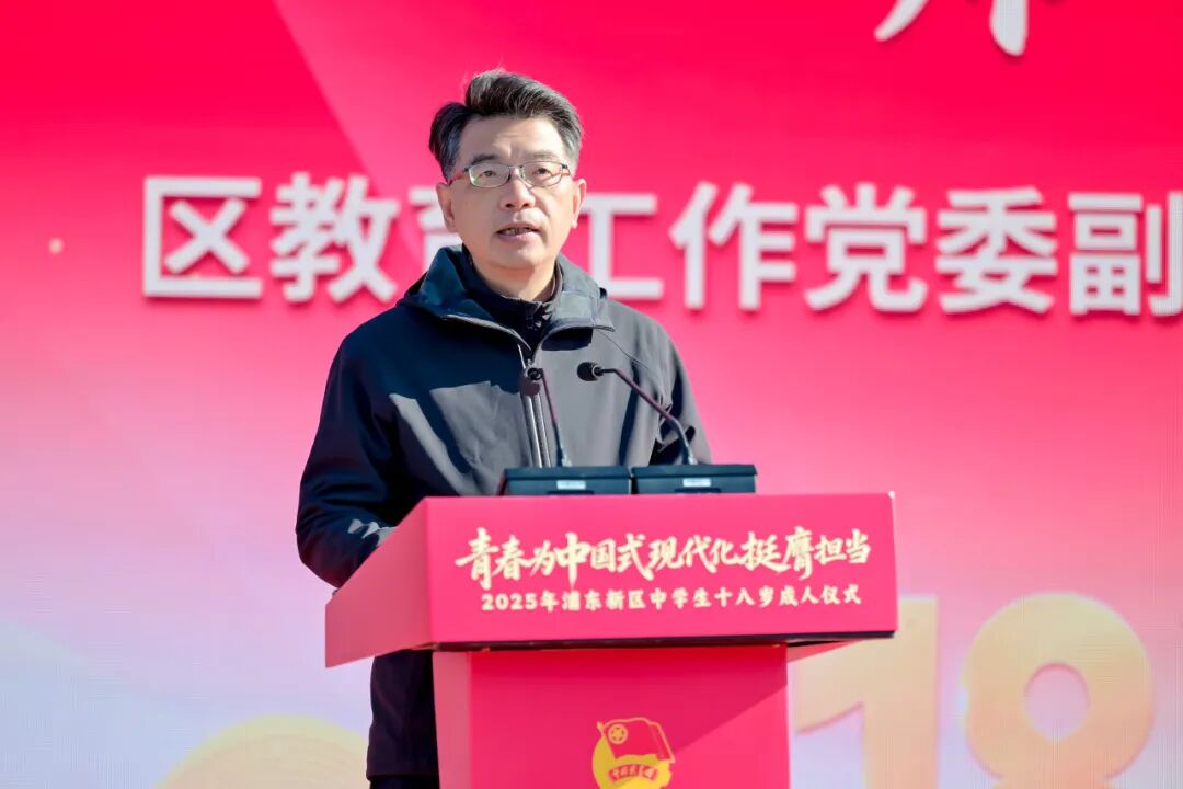 十八岁成人仪式2025年12月4日上午,在第十二个国家宪法日之际,2025年浦东新区中学生十八岁成人仪式在上海第二工业大学附属浦东振华外经职业技术学校隆重举行。区教育工作党委副书记、教育局副局长毛力熊,团区委副书记顾尉迪,中国极地研究中心(中国极地研究所)、极地环境监测中心高级工程师、副主任蓝木盛,团区委学生工作部部长、区教育局团工委书记饶之琛,上海第二工业大学附属浦东振华外经职业技术学校党总支书记张董平、副校长魏魏,以及上海市浦东外事服务学校、上海市航空服务学校、上海第二工业大学附属浦东振华外经职业技术学校、上海市群星职业技术学校的学生代表与家长代表等300人出席活动,共同见证浦东新区青年学子迈入成年的重要时刻。