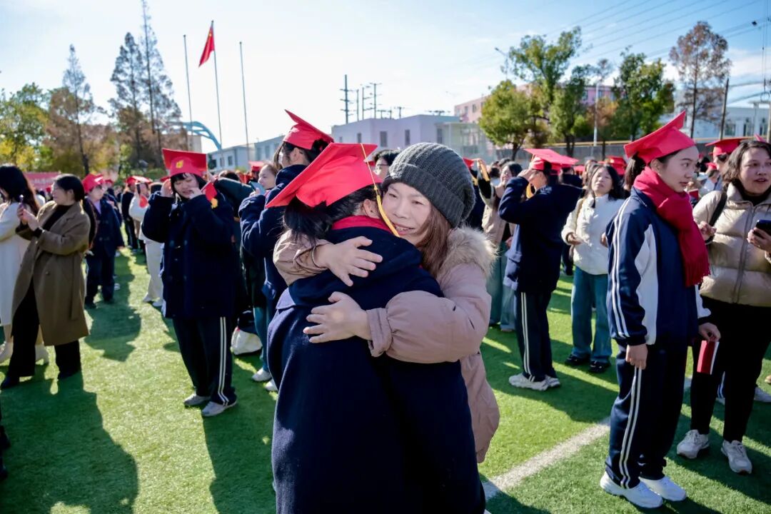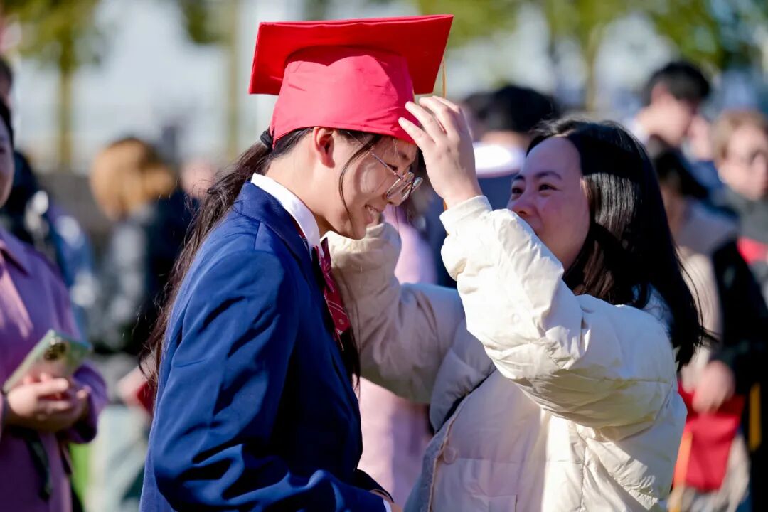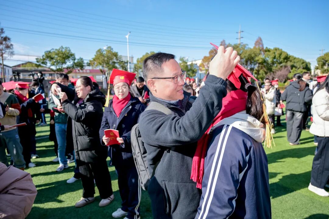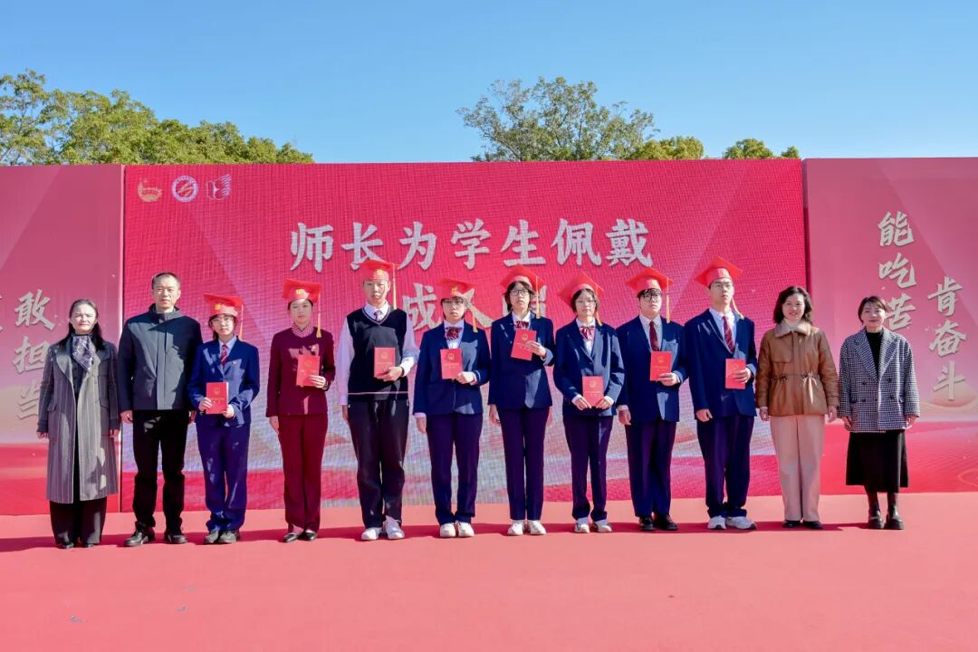 在感恩礼环节,顾尉迪、张董平、饶之琛、魏魏等老师和家长们亲手为学生们佩戴成人帽,学子们向师长、家长鞠躬行礼,在传统礼仪中感悟感恩与成长的意义。