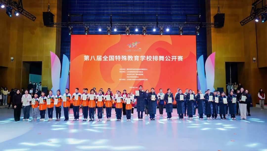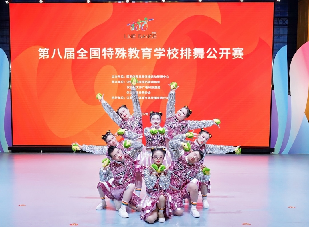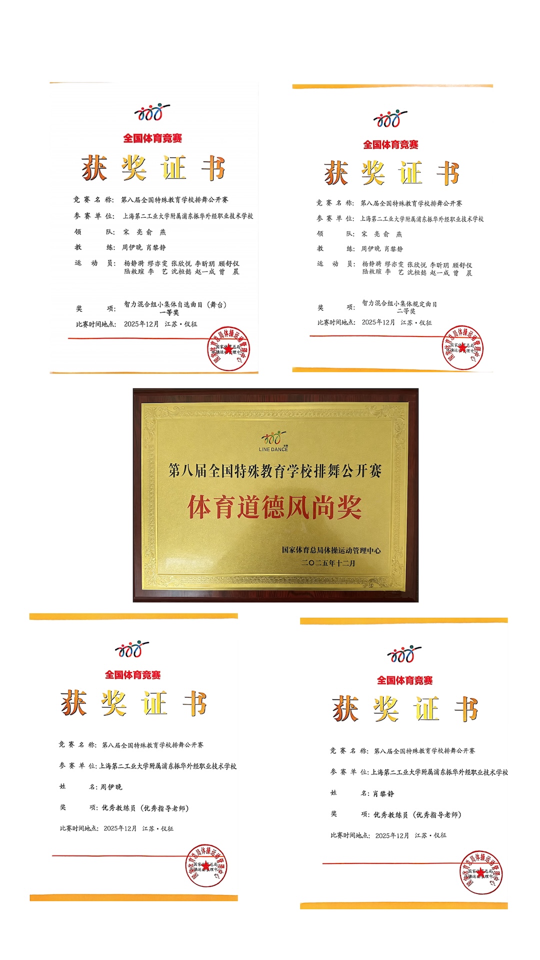 2025 年 12 月 1 日至 6 日,第八届全国特殊教育学校排舞公开赛在扬州仪征世博园举行。上海第二工业大学附属浦东振华外经职业技术学校“晓鹭”排舞社代表上海市参赛,经过激烈角逐,最终斩获智力混合组自选曲目小集体组别一等奖;智力混合组规定曲目小集体组别二等奖;并荣获本届赛事“体育道德风尚奖”荣誉称号!不仅为上海赢得荣誉,更展现了浦东新区中职特殊学生自强不息的精神风貌。他们用灵动舞步诠释生命力量,以执着坚守书写成长篇章。