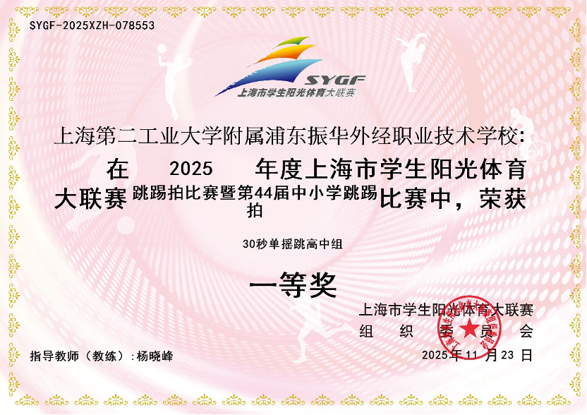 2025年度上海市学生阳光体育大联赛暨第44届中小学生跳踢拍比赛30秒单摇跳一等奖