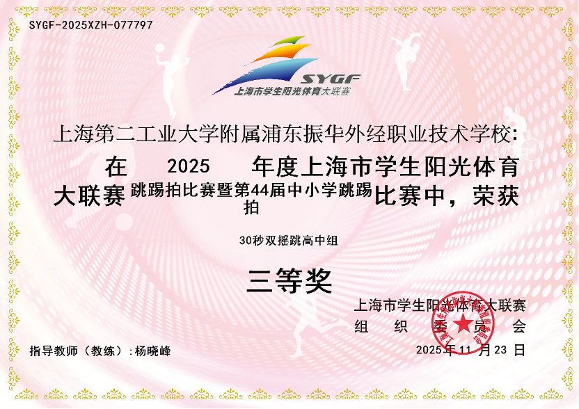 2025年度上海市学生阳光体育大联赛暨第44届中小学生跳踢拍比赛30秒双摇跳三等奖