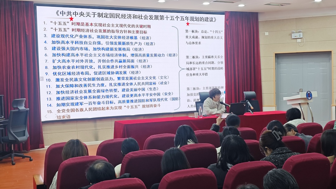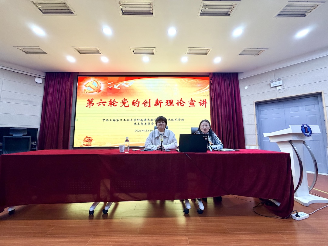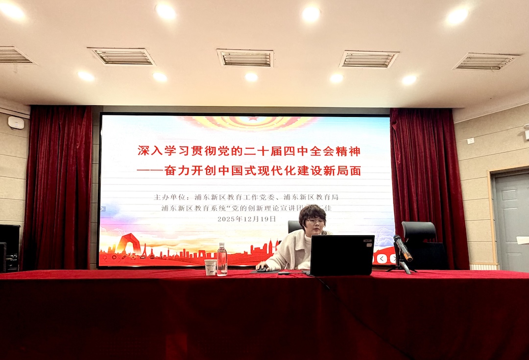 2025年12月19日,振华职校党总支举行“第六轮党的创新理论宣讲”大会。浦东新区教育系统“党的创新理论宣讲团”成员丁佳老师为与会人员作了《深入学习贯彻党的二十届四中全会精神——奋力开创中国式现代化建设新局面》的专题报告。本次活动旨在深入贯彻党中央关于“十五五”时期的战略部署,全校党员教师及骨干力量齐聚一堂,共绘发展蓝图。