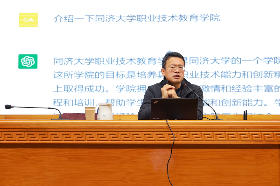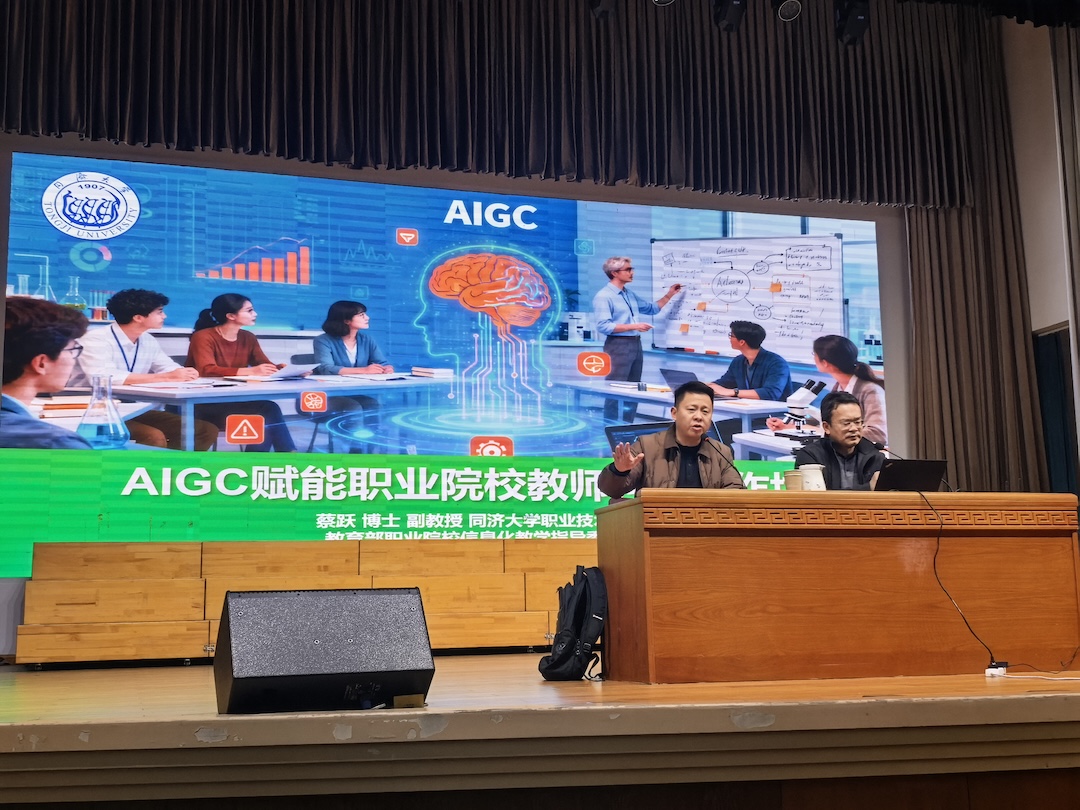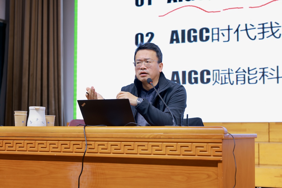 蔡跃博士以“AIGC赋能职业院校教师教学与科研工作坊”为题,展开了一场内容丰富、视野前沿、实操性强的专题讲座。讲座围绕“AIGC时代我们的共识”“AIGC时代我们如何生成内容工作”以及“AIGC赋能科研工作坊”三大模块层层推进。